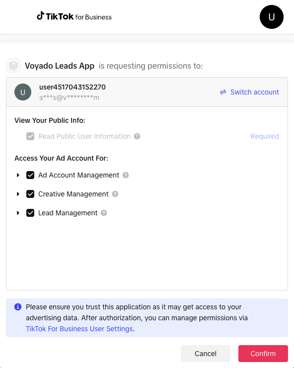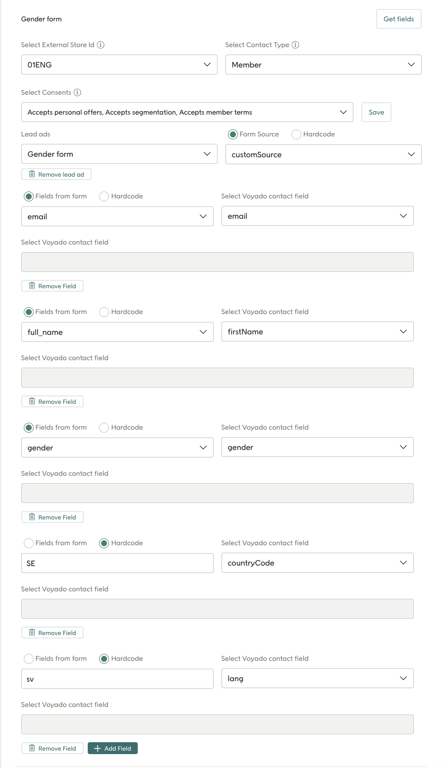 Once you have done that, you will get a list of forms under TikTok forms. Press on the form that you want to connect to Voyado Engage and then press the button "Get fields". This will retrive all the fields on that specific form.