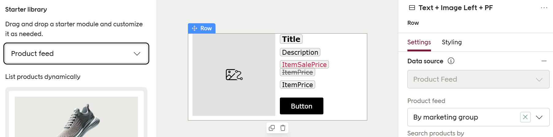 - Elements in your module use dynamic data, for example ImageUrl for the dynamic image source, Title for the product title, ItemPrice for the regular price, etc.